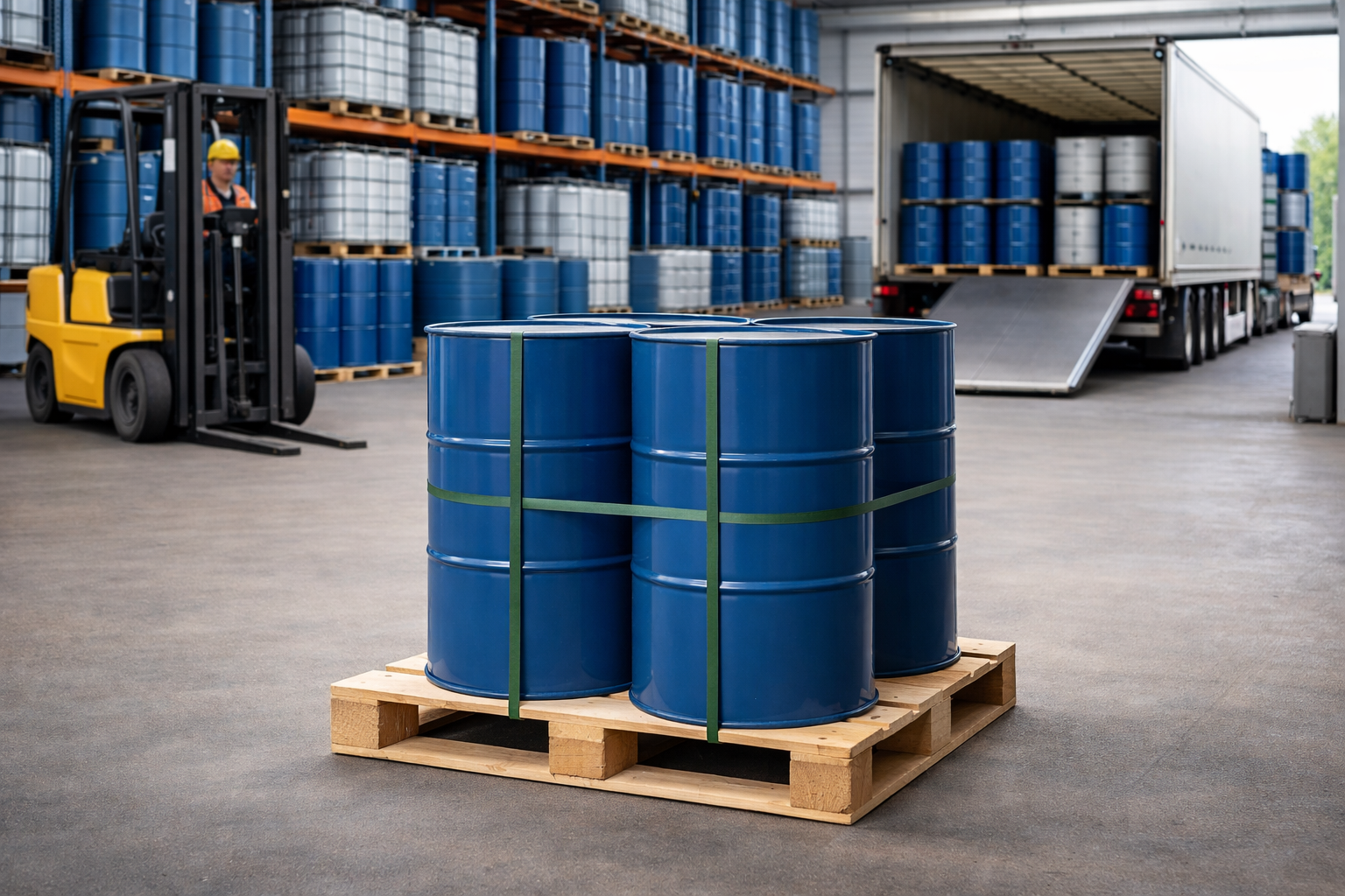 Vor allem Fässer werden einfach und rückenschonend auf verschiedenen Palettenarten umreift.