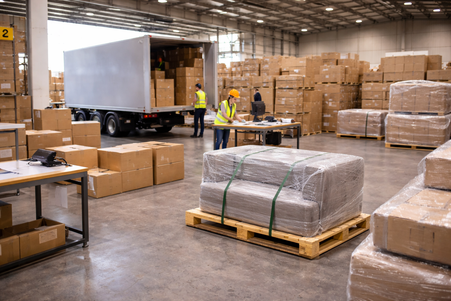 Große Warenmengen mit vielen Varianten werden effizient auf Paletten gebündelt und versendet.